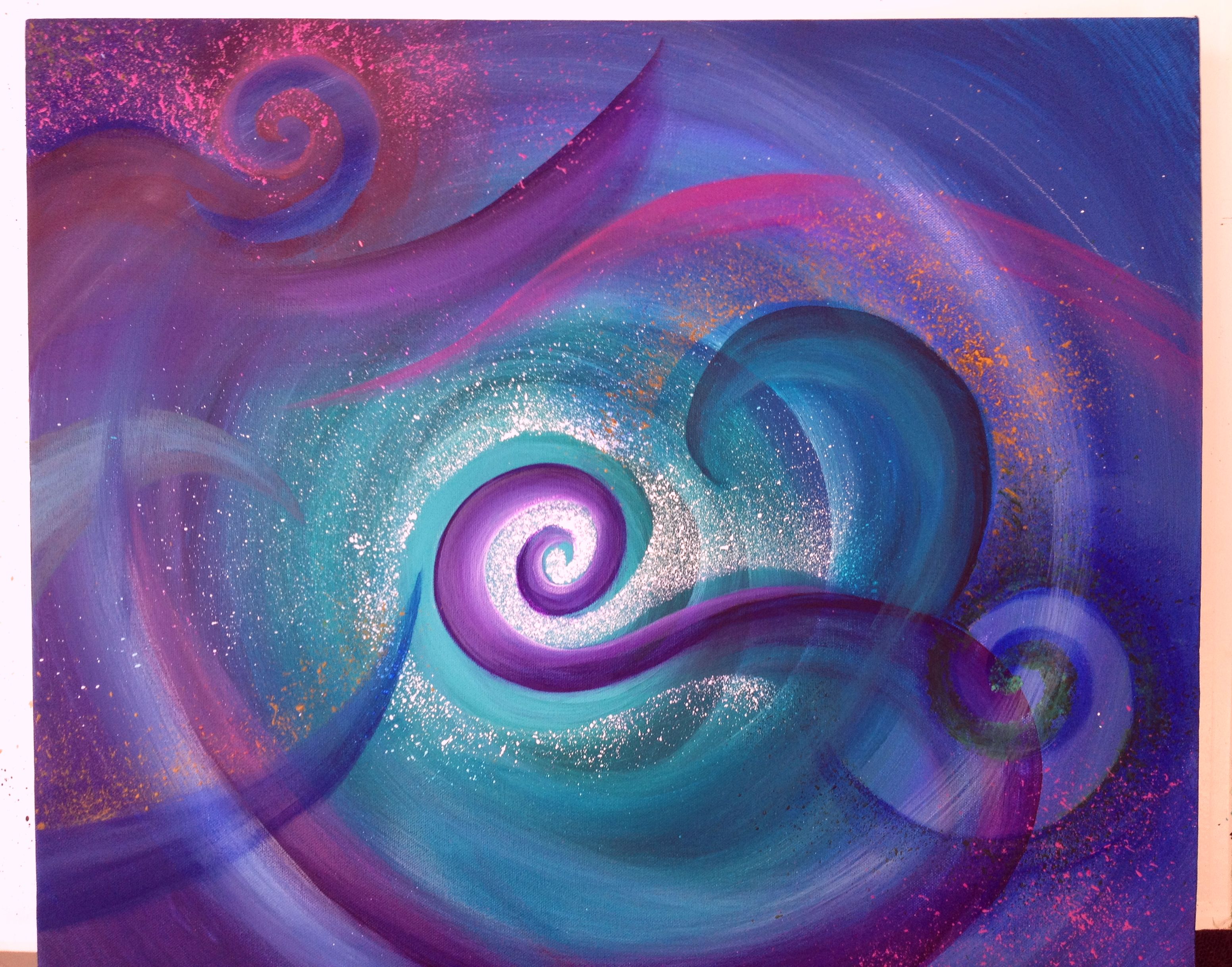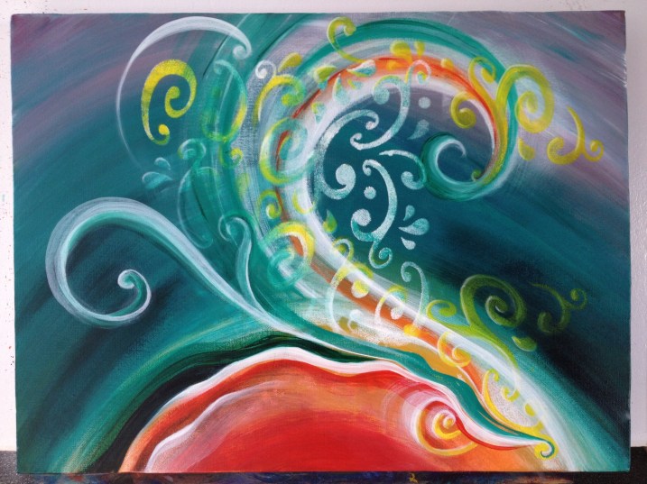 Almost finished this piece above 🙂 I decided I wanted to experiment with contrasting colours, so used the reds/oranges with the greens/teals… and I have to say, Im liking the result so far. This piece didn’t start off so well…. in fact it was painted over at least twice before I felt an ease and flow with what I was doing. Unlike how I usually paint (lightening speed!) I have taken my time with this, lots of pauses, looking, walking away, and revisiting… getting the bones of it on the canvas was not the issue, it was more, what to do with it after that. ‘I decided it was going to be part of my Magical Wave series, and once I had made that decision, it just flowed along (no pun intended!) nicely.