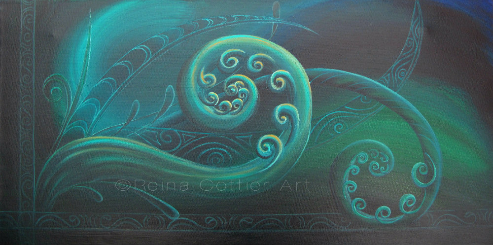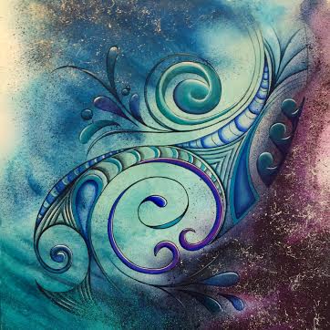 acrylic on canvas, with a rustic ‘wood’ look background with my  designs of korus, swirls and intense vibrant colour.