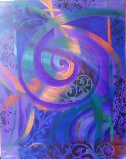 yes, something different for me! I had been ITCHING to try this style for ages, using a water spray on the canvas first then applying the paint with a sponge and letting it drip and spread with the water around the canvas. This was FUN! I loved doing it, and I will do it again at some point, and or integrate this technique with my other stuff. There was alot of drying time inbetween stages involved, so that was slightly irritating to this ‘I want everything yesterday’ girl, lol! but hey, with a little help from a friend- a fan heater- we got there relatively quickly! (Im not into waiting for hours, its just not part of who i am, if i cant bang out a painting in an hour or 2, forget it! LOL!)