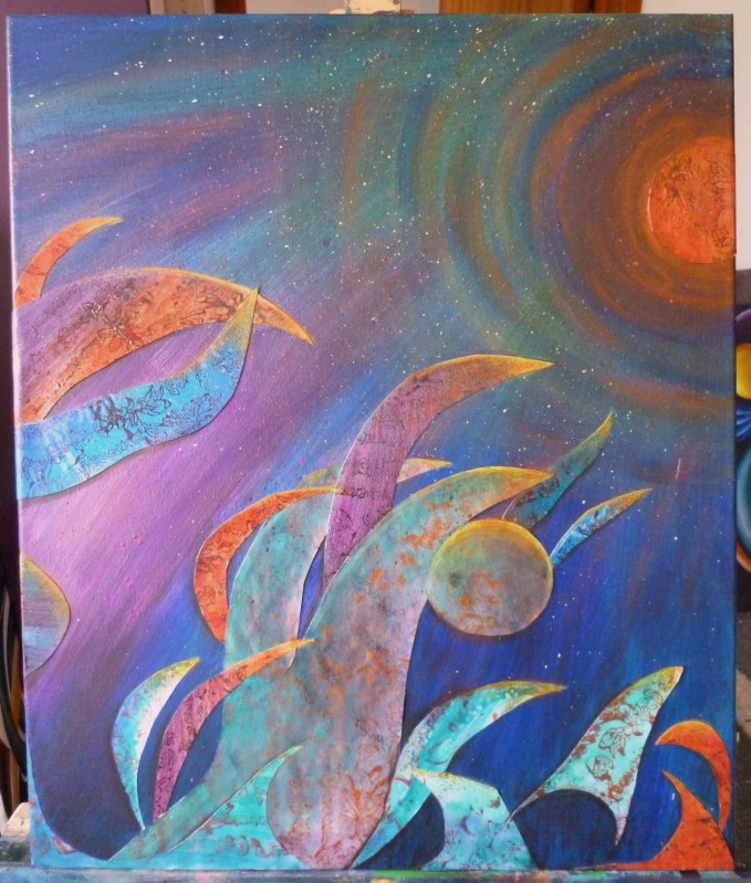 Im playing with words directly onto the canvas (like “Evolve-last post) rather than Photoshopping them on as i normally do. Also integrating my BELOVED stencils (can you tell??? hehe) with the word process…. this was very much about the earth below- foliage, forest, land, growth…then the sky, galaxy above,..there is a heart shape up there-unfinshed, you can barely see, but i think it will be cool when its done… i want to maintain the translucent look of it… love that.