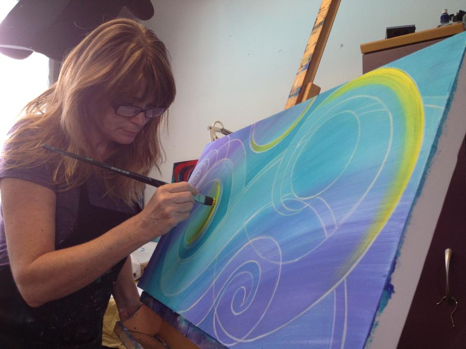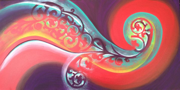 Again, I am really enjoying this piece. It took a bit of ‘sorting out’ , getting the flow of lines correct, making sure everything had a flow, and yet, I didn’t want everything to have the ‘full stop’, i quite like some movement just disappearing off into nothing ness, and some ‘lines’ just not really going anywhere, but yeh within of that, it needed a balanced, or it looked completely off. At one point I had to keep walking away from it for several hours, and returning for that ‘fresh look’, so I could actually see what was happening on the canvas. I chose these colours because I wanted a real feel of the ocean (blues, greens, teals,) with dynamic energy & power (reds, purples & yellow). The white is fro drama, and also I like how it reminds me of ocean spray, froth, light through water… really love that. The ocean is in my blood and has been since I was born. I have never been able to love too far from the sea, ONCE when I was 19 I loved inland, not far, only about 10km from the sea (here in NZ that is inland! haha) and I loathed it, I felt claustrophobic, I was always trying to get out to the sea, so I made a resolution to never do that again, and since then I have never lived more than about 200m from the waters edge.